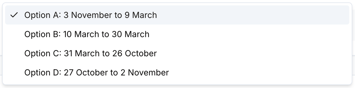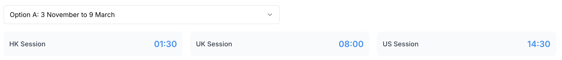 Each day starts with selecting a schedule group, which encapsulates the time-based context (e.g., "Winter — US Opens Early"). This group determines: