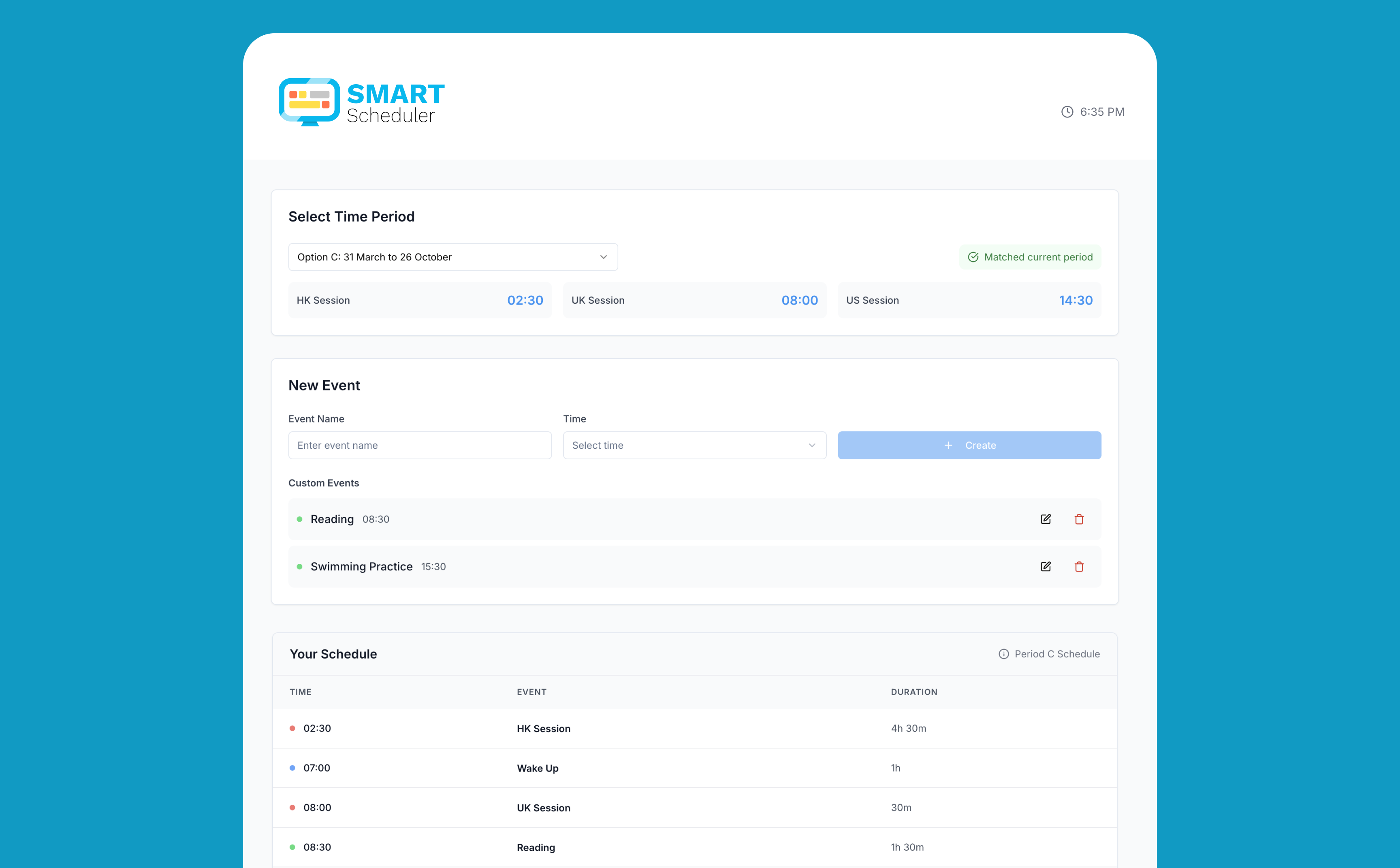 I designed Smart Scheduler with my friend — a professional global trader — in mind. His lifestyle perfectly encapsulated the challenge: